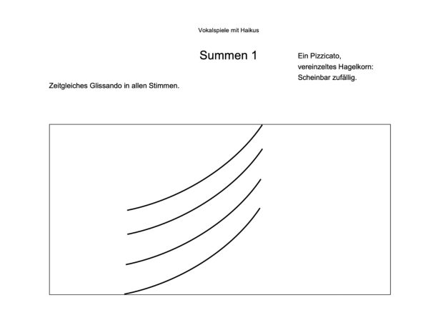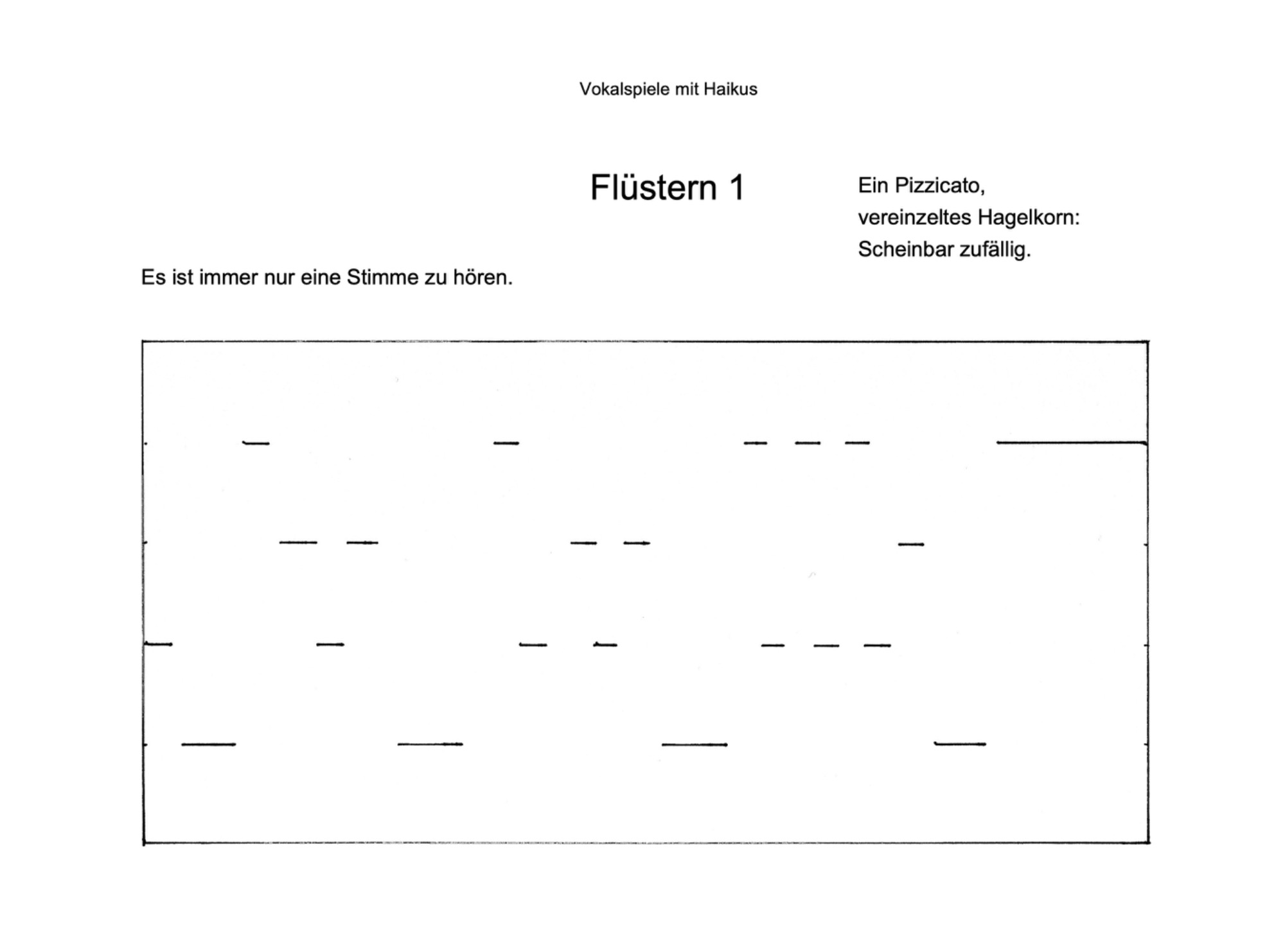 Die "Vokalspiele mit Haikus" entstanden in Zusammenarbeit mit dem "Vokalensemble Sakura Wien" als Beitrag für das "Aufspiel" anlässlich des 200jährigen Jubiläums der Universität für Musik und darstellende Kunst Wien im Jahr 2017 in den Räumen des Wiener Konzerthauses. Beim "Aufspiel" sollte es sich - laut Ausschreibung der mdw - um kleine "flashmobartige Vokalminiaturen" handeln. Wegen des vokalen Miniaturformats dachte ich sofort an Haikus. Ich schrieb fünf Haikus, welche Grundlage der Komposition wurden. Während der Proben erarbeiteten das "Vokalensemble Sakura Wien" und ich zusammen die Realisierung. Das Ergebnis ist ein Weg von der Stille zum Klang. Am Anfang der ein- bis zweiminütigen Performances stehen Haltungen und Gesten. Über Flüstern und Summen nähert sich die Artikulation einem rhythmisierten Sprechen oder Singen an. Am Ende jeder Performance steht das Haiku: zuerst in japanischer, dann in deutscher Sprache. Die Haikus wurden von Tomoko Tanaka ins Japanische übersetzt.